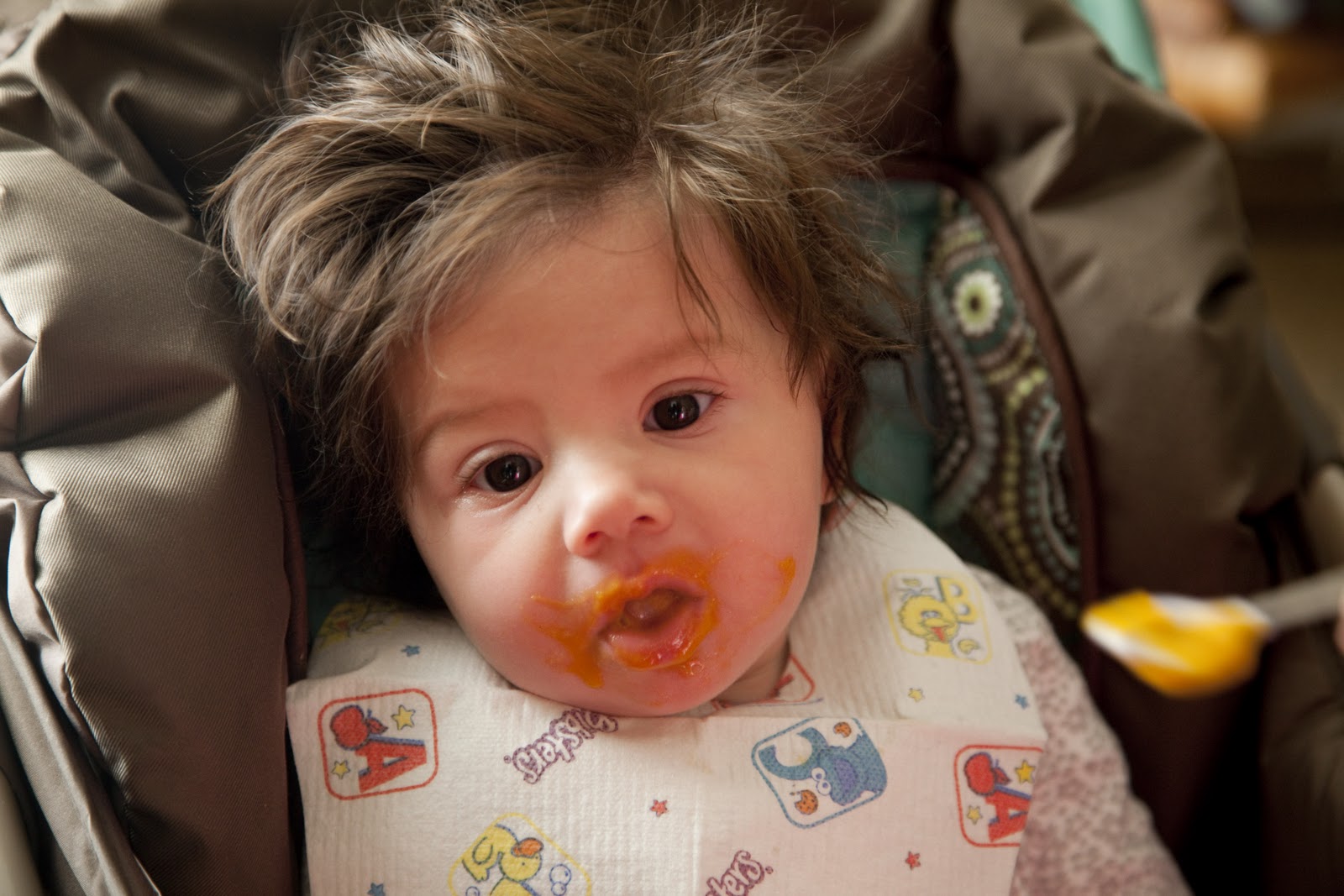 She is really a good little eater and has tried all sorts of different foods. No, she has not had carrots yet, but we plan on introducing them this week. So far her favorites seem to be green beans, sweet potatoes, pumpkin, squash and pears. She is less enthusiastic about peaches, mangos and oatmeal, but she eats everything we give her without too much of a problem. I also have just introduced those freeze-dried yogurt puff things to her so that she can start to figure out how to use her fingers to put food in her mouth on her own, but she acts like they are the worst thing in the world whenever I stick one on her tongue.