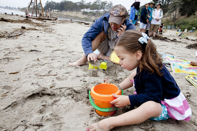 Paul's parents are in town for a visit (and they were only here six weeks ago! lucky!) so we decided to spend Saturday at the beach (which ended up being super smart because it was crazy hot in the valley but overcast and moderate and lovely by the ocean.) There was a high surf warning and the beach was sort of a mess with piles and piles of kelp and driftwood that had been washed up on shore thanks to the high surf conditions, but it was still beautiful in an unusual sort of way. We found a nice spot to lay out our beach blanket and pull out the sand toys and Clara had a ball digging in the sand and destroying sand castles that Grandpa Nash made for her.
