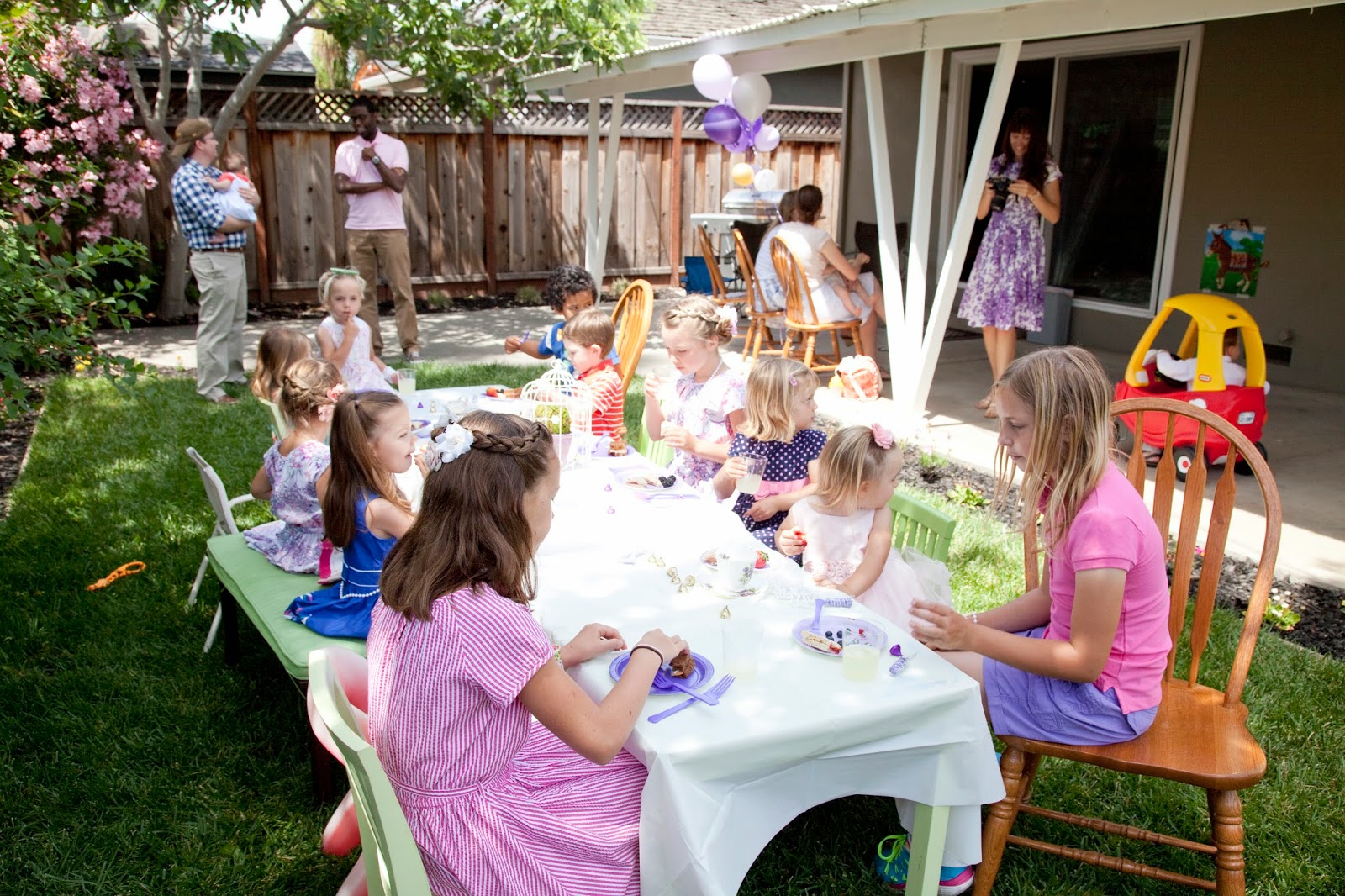 We invited all her little friends (and their parents and siblings too - why not, right?) to come over from 11-1 for tea sandwiches, croquet, and lemon cupcakes. I wish my timing had been better for this party but I just didn't get enough done up front and ended up having to scrap a number of ideas/projects (I wanted to cut the white roses from the front yard and put them in small vases on the tables but it didn't happen and I was going to do rainbow fruit kabobs and had all the fruit purchased but we ended up just throwing it in bowls rather than taking the time to skewer it all and I looked high and low for inexpensive kid gloves for the girls to go with their pearl necklaces but couldn't find the cheap ones I found for Clara for her Easter basket) and I didn't get great pictures of the setup before the party started. But thankfully we have amazing friends who pitched in as soon as they showed up helping me finish up the food and taking pictures with our camera, etc.